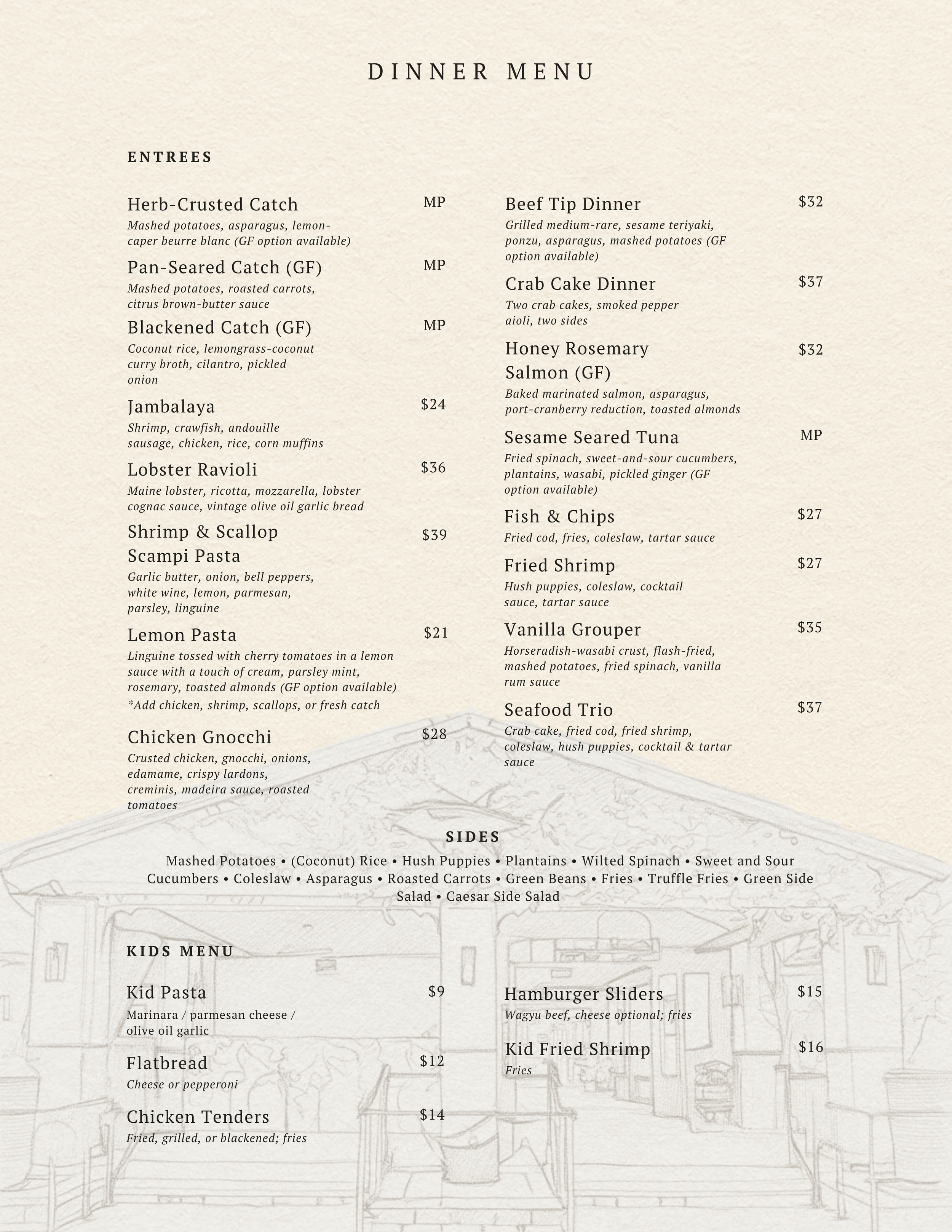 Dessert menu with options including Chocolate Lava Cake, Creme Brulee, Rum Cake, Coconut Cake, Key Lime Cup, Chocolate Mousse Cake, Irish Coffee, and Espresso Martini, with prices listed